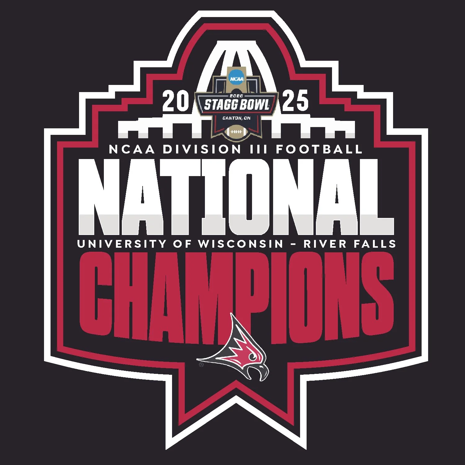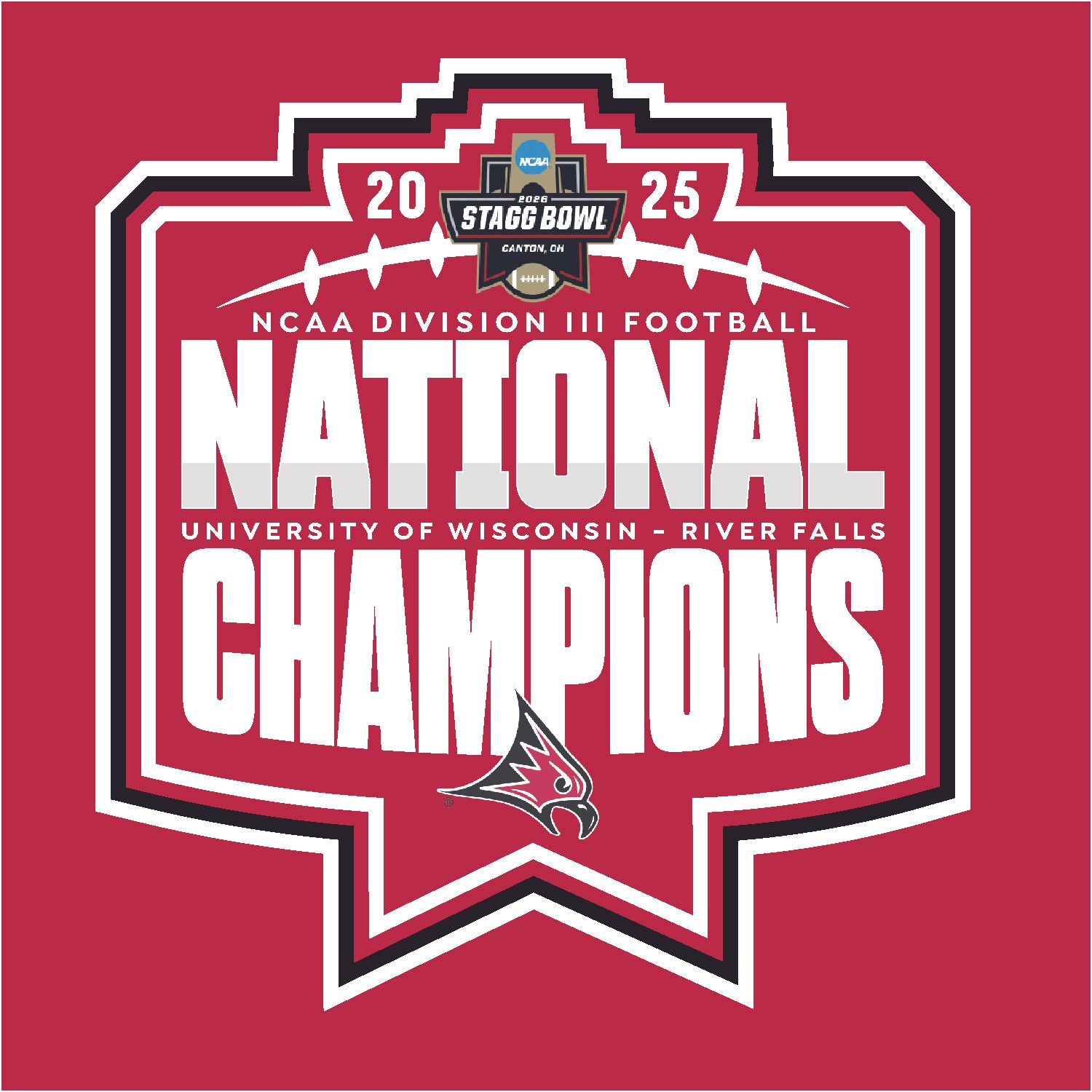 This project has a special place in my heart. As a UW-River Falls alum and former Falcon Football Player and Coach, seeing your team reach the Division III National Championship was sweet enough, but to win it is something different. Saturday, January 3rd, 2026, at 7:30 a.m., I received an email from a member of the UW-River Falls administration explaining that should we win tomorrow night, we need a logo ready to go. So, with a 7 p.m. Sunday Kick-Off, I had a little under 36 hours to put together a logo that would encapsulate everything that this season meant to the players, coaches, administration, and alumni. The hardest part of the entire project was that there was a chance that it would never be seen by the light of day. However, spoiler, the Falcons pulled it off.